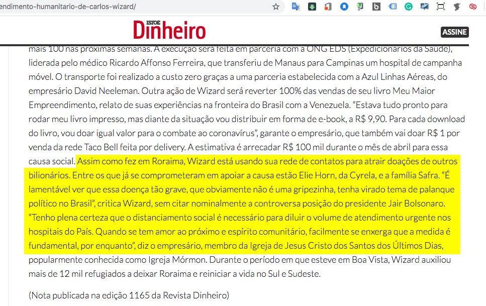 No mesmo site, publicação intitulada ‘O segundo empreendimento humanitário de Carlos Wizard’, postada neste sábado (6/Jun)(Veja Aqui), Wizard ao comentar a campanha em que usa “sua rede de contatos para atrair doações de outros bilionários”, o empresário replica Nota publicada na edição 1165 da Revista Dinheiro (3/Abr)(Veja Aqui), em que aborda a gravidade da pandemia e observa não se tratar de uma ‘gripezinha’, termo utilizado por Bolsonaro, para minimizar o Covid-19.
