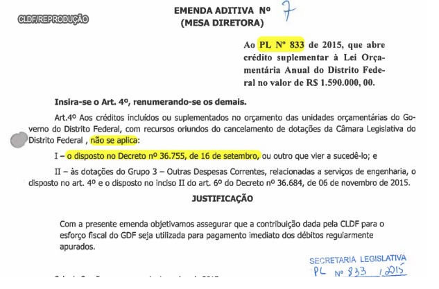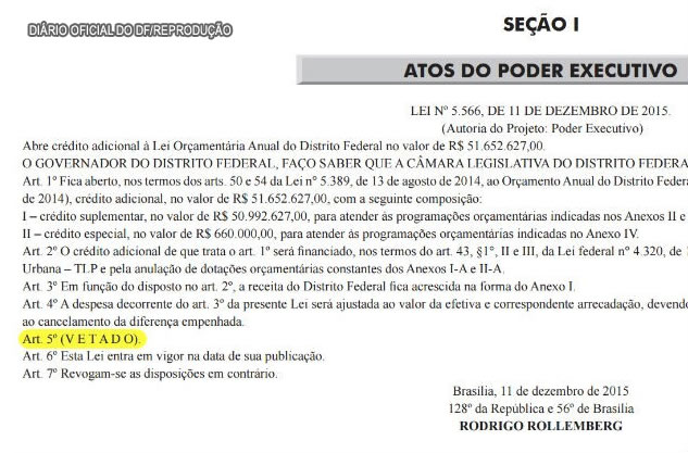 – Apesar de irregular, a emenda foi aprovada e enviada mais uma vez à sanção do governador Rollemberg. Desta vez, o texto passou na íntegra e foi publicado como lei 5596, em 28 de dezembro de 2015. O texto permitia que todos os créditos surgidos de “cancelamentos orçamentários” da Câmara fugissem do cronograma de dívidas – incluindo aqueles R$ 31 milhões aprovados anteriormente.
