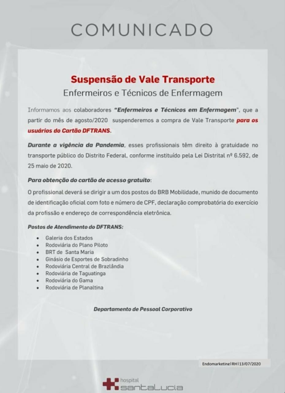 De acordo com o aviso, a suspensão da compra de Vale Transporte, destinado aos enfermeiros e técnicos em enfermagem, aos usuários do Cartão DFTrans. De acordo com comunicado emitido pelo HSL, em decorrência da vigência da Lei.