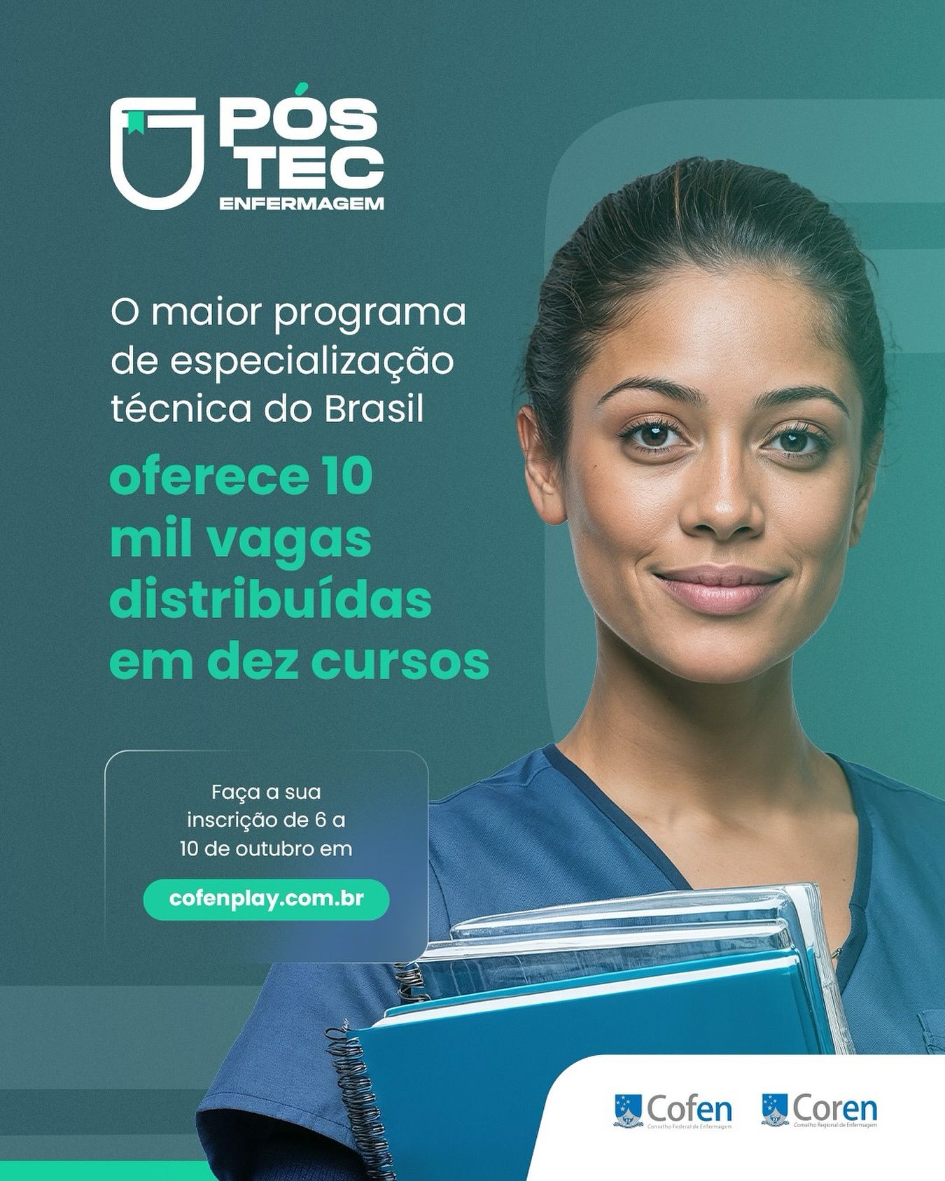 O Conselho Federal de Enfermagem (Cofen), em parceria com a Universidade Federal da Paraíba (UFPB), anunciou a quarta edição do Pós-Tec Enfermagem, o maior programa gratuito de especialização para técnicos de Enfermagem do Brasil. Nesta edição, serão oferecidas 10 mil vagas em 10 cursos de especialização, além da formação de cadastro reserva, consolidando uma iniciativa que já qualificou mais de 17 mil profissionais em todo o país.