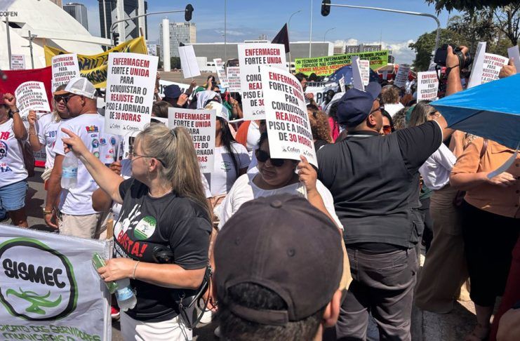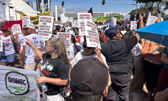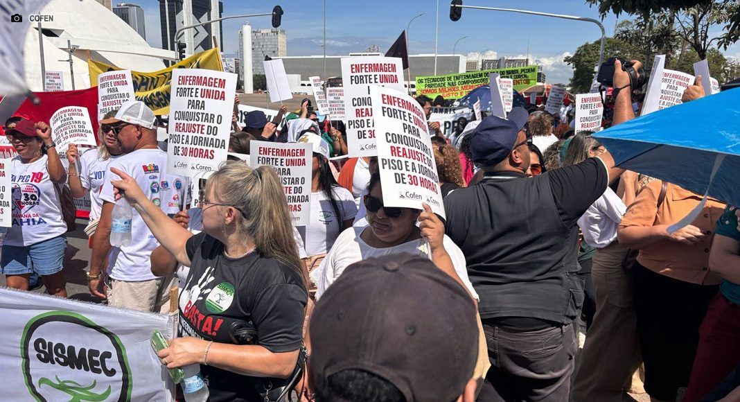 Em frente ao Congresso Nacional, representantes de conselhos, sindicatos e entidades que representam enfermeiros, obstetras, técnicos e auxiliares se revezaram em discursos potentes cobrando valorização e respeito. As palavras de ordem foram amplificadas por centenas de profissionais e estudantes que, sob forte sol, se mantiveram mobilizados para mostrar a força da profissão.