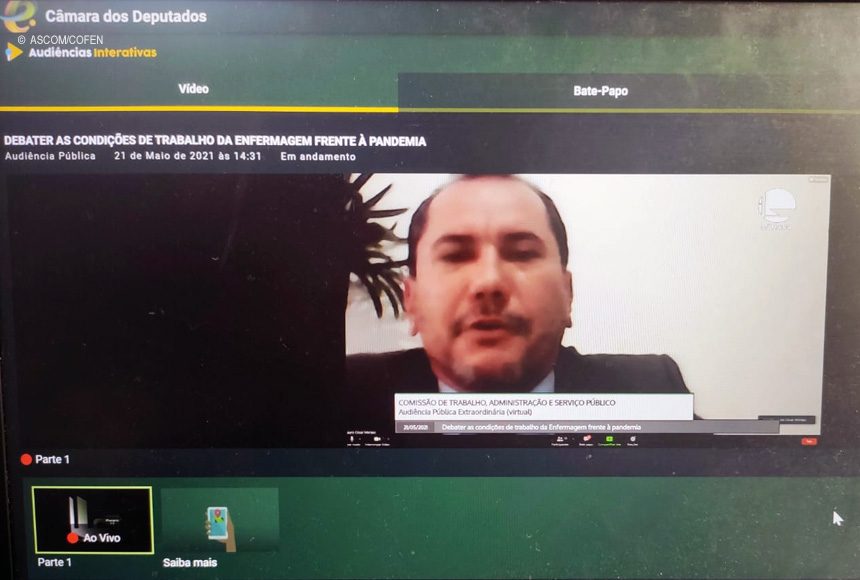 A audiência, convocada pelo deputado Mauro Nasif (PSB -RO), foi realizada pela internet e transmitida ao vivo no site da Câmara, com a participação do Conselho Federal de Enfermagem (Cofen) e demais entidades que integram Fórum Nacional da Enfermagem: Federação Nacional dos Enfermeiros (FNE), Confederação Nacional dos Trabalhadores na Saúde (CNTS), Confederação Nacional dos Trabalhadores em Seguridade Social (CNTSS), Associação Nacional dos Auxiliares e Técnicos de Enfermagem (Anaten), Executiva Nacional dos Estudantes do Enfermagem (ENEEnf) e Associação Brasileira de Enfermagem (ABEn).