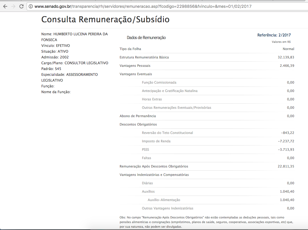 Funcionário do Senado Federal, Fonseca conta com um contracheque recheado de aproximadamente R$ 35 mil, valor que chega a ultrapassar o teto constitucional, embora conte com o devido desconto do excesso.