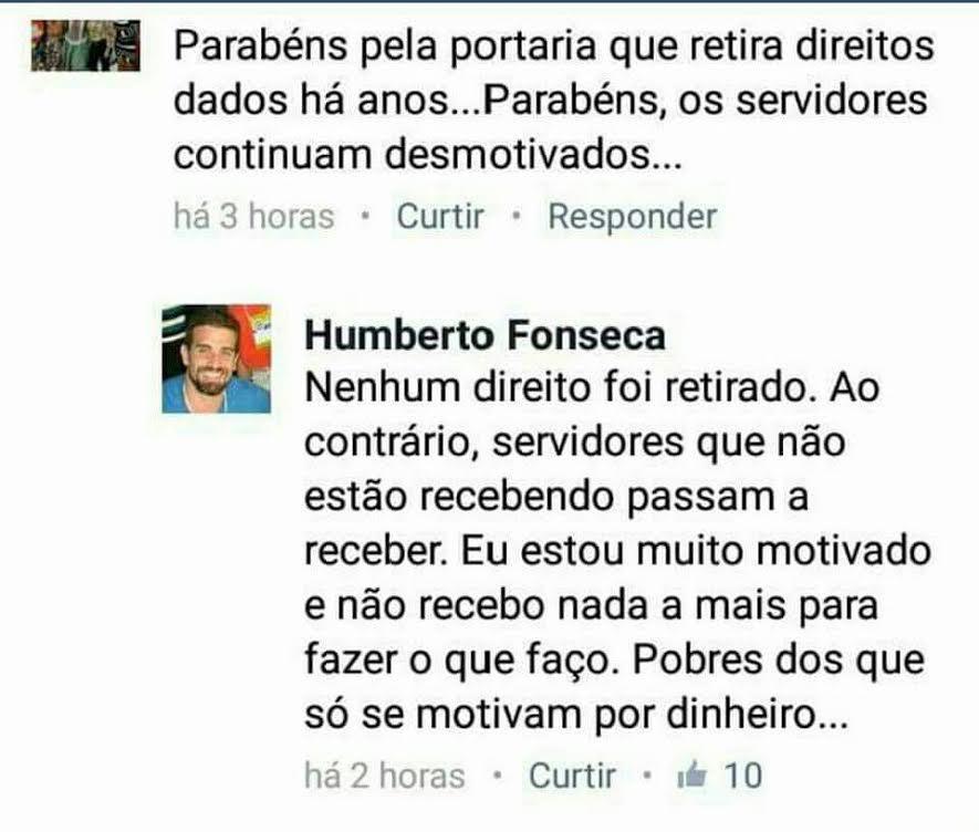 “Nenhum direito foi retirado. Ao contrário, servidores que não estão recebendo passam a responder. Eu estou muito motivado e não recebo nada a mais para fazer o que faço. Pobres dos que só se motivam por dinheiro…”.