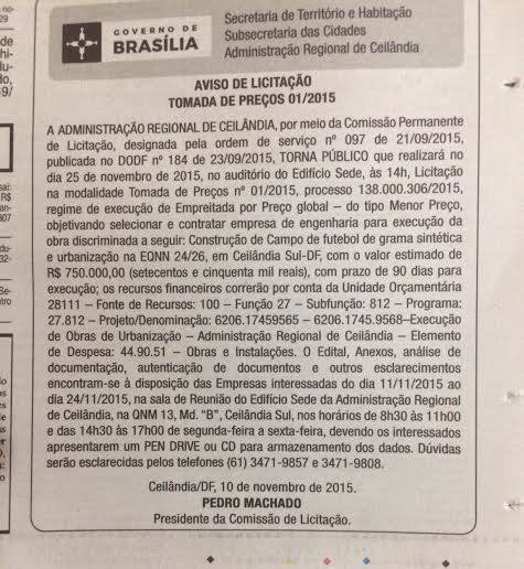 Na terça-feira (10/Nov), a Tomada de Preços (TP) 01/2015, também ganhou notoriedade. Isso porque o objeto da TP tem por objetivo a construção de Campo de futebol de grama sintética e urbanização da EQNN 24/26, em Ceilândia Sul. O valor estimado da obra é de R$ 750 mil.