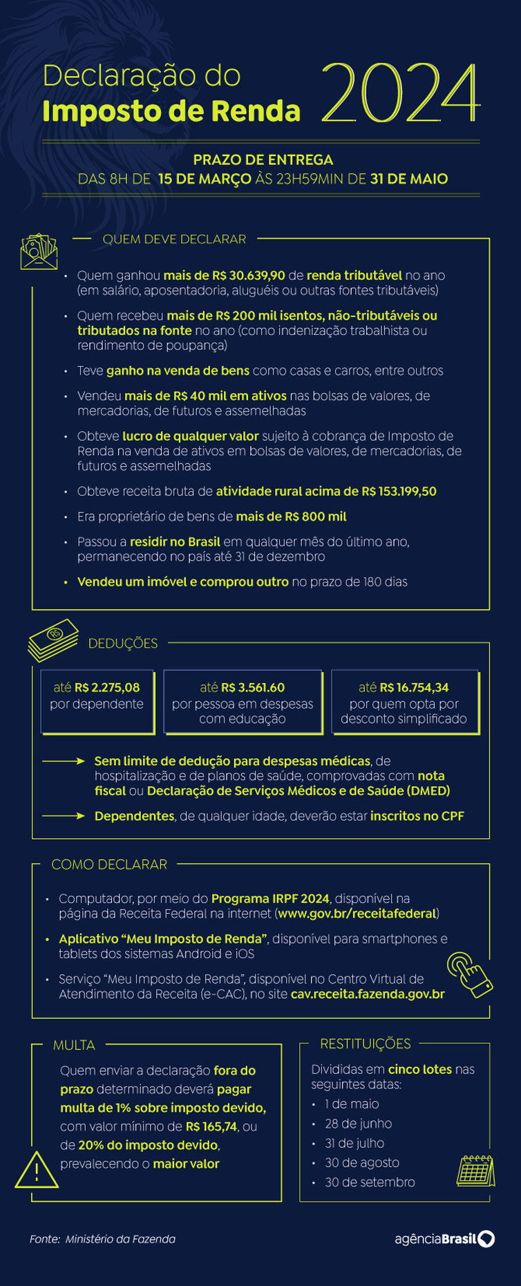 Segundo a Receita Federal, as mudanças farão 4 milhões de contribuintes deixarem de declarar Imposto de Renda neste ano. Mesmo assim, o Fisco espera receber 43 milhões de declarações em 2024, mais que as 41.151.515 entregues em 2023.