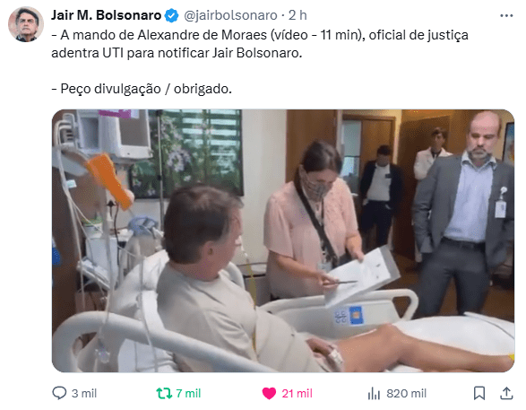 Na mesma noite, após a efetivação da entrega da intimação assinada às 12h47, Bolsonaro divulgou nas redes sociais, um vídeo em que mostra a atuação da servidora. Publicação essa que o ex-presidente ratificou a ação de “Alexandre de Moraes” e pediu a divulgação da gravação publicada.