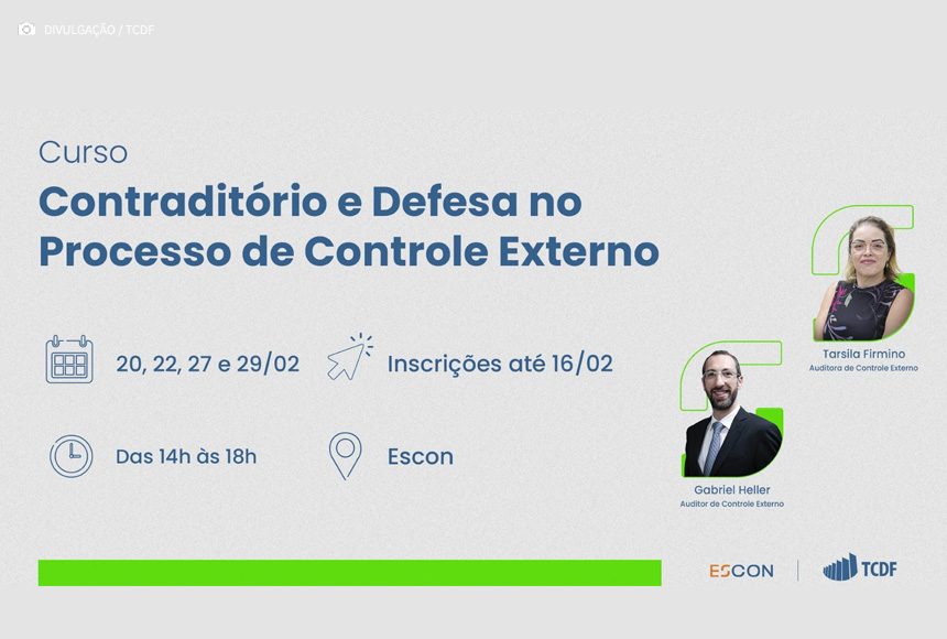 A Escola de Contas do TCDF está com inscrições abertas para o curso “Contraditório e Defesa no Processo de Controle Externo”. O treinamento é voltado aos servidores públicos do Governo do Distrito Federal, da Câmara Legislativa do DF e do próprio Tribunal de Contas.