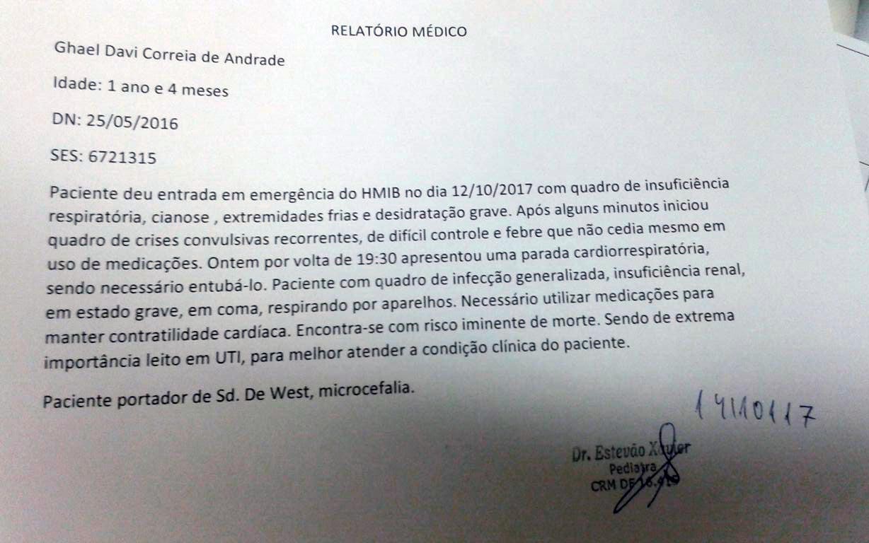 PD teve acesso ao relatório do pequeno Ghael, onde o médico responsável pelo atendimento de Ghael aponta um quadro de insuficiência respiratória, cianose, extremidades frias e desidratação grave. O bebê apresentou ainda crises convulsivas, parada cardiorrespiratória, foi entubado, contraiu infecção generalizada e está em coma, onde respira com ajuda de aparelhos. Porém, ainda assim o paciente permanece internado, no semi-intensivo do HMIB, à mercê da própria sorte.