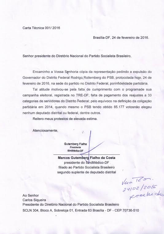 O presidente do Sindicato dos Médicos do DF (SindMédico-DF), Gutemberg Fialho, entrou com representação em que pede a expulsão do governador do DF, Rodrigo Rollemberg (PSB),  junto ao Conselho de Ética e Fidelidade Partidária do Partido. Entre os motivos elencados o Sindicalista, alega descumprimento do Manifesto, Programa, Estatuto e Código de Ética e Fidelidade Partidária. A medida ocorre após o ex-chefe de gabinete de Rollemberg, Rômulo Neves, (ex-PSB, recém-filiado à Rede Sustentabilidade), representar contra Fialho, junto ao PSB-DF.