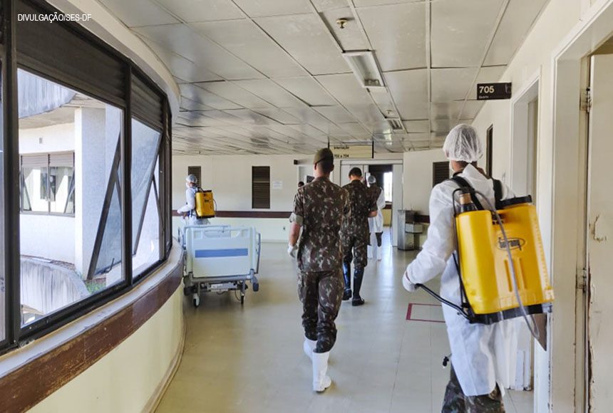 Militares do Exército Brasileiro sanitizaram e desinfectaram todas as alas de circulação do Hospital Regional da Asa Norte (Hran), na manhã desta sexta-feira (15). O serviço foi realizado a pedido da superintendência da Região de Saúde Central. Nove soldados percorreram as alas higienizando-as com uma solução composta por álcool 70% e hipoclorito de sódio.