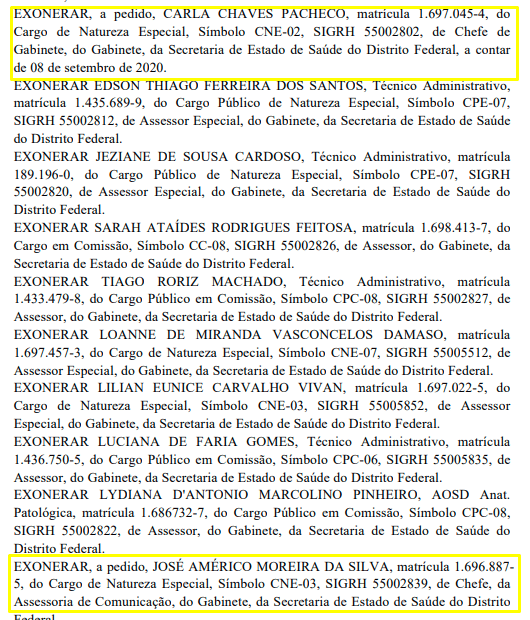Foi publicado no Diário Oficial do DF desta quarta-feira (09), as exonerações de Carla Chaves Pacheco, chefe de gabinete da Secretaria de Saúde do DF e José Américo Moreira da Silva, chefe da Assessoria de Comunicação da SES-DF. De acordo com a Pasta, as exonerações foram a pedido e por motivo de ajuste da equipe com a nova gestão. Ainda não foram nomeados os substitutos.