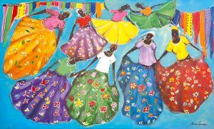 O Quilombo Kalunga Vão de Almas é reconhecido pela Organização das Nações Unidas (ONU) como o primeiro território no Brasil conservado pela comunidade. A artista se inspira na dança Sussa (tradicional dos Kalunga), na festa tradicional de Nossa Senhora da Abadia, no meio ambiente, nos frutos do Cerrado, nos quintais, na paisagem infinita, em utensílios ancestrais, nas práticas culturais sincréticas, no trabalho agroecológico e a na estreita harmonia dos Kalunga com a natureza.