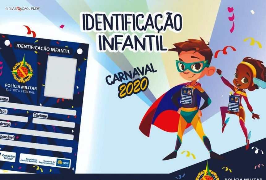 Há anos, a Polícia Militar do Distrito Federal (PMDF) faz campanha para que os pequenos possam curtir a folia com segurança, assim como os adultos que acompanham as crianças. Para tanto, a corporação disponibiliza em seu site um modelo de identificação com espaço para foto, nome, idade, telefone, endereço e responsável. No link, é possível gerar o crachá e imprimi-lo.