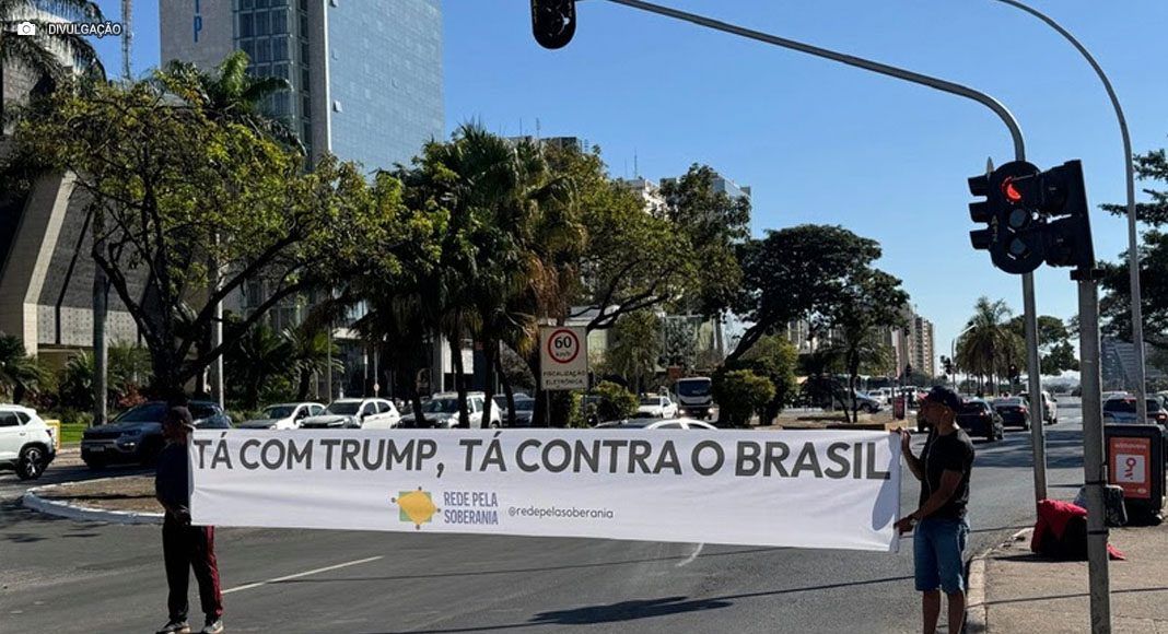 A Rede Pela Soberania, coletivo formado por organizações e pessoas que não aceitam as retaliações injustificadas do governo dos Estados Unidos contra o Brasil, realizou nesta segunda-feira (11 de agosto) um “faixaço” em diversos pontos de Brasília. “Tá com Trump”, tá contra o Brasil, estampavam as faixas.