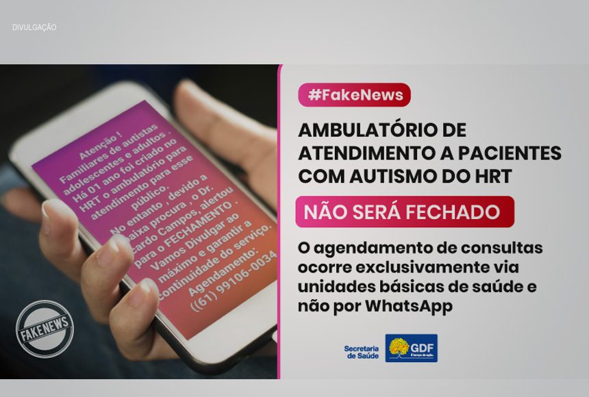 O ambulatório que atende pacientes autistas no Hospital Regional de Taguatinga (HRT) não será fechado por falta de atendimento. O esclarecimento foi dado pela diretoria de Atenção Secundária da Região de Saúde Sudoeste após a disseminação de uma mensagem informando um possível fechamento da unidade. O texto, que circula em vários grupos do Facebook, WhatsApp e Instagram diz que o motivo é por falta de público para atendimento.