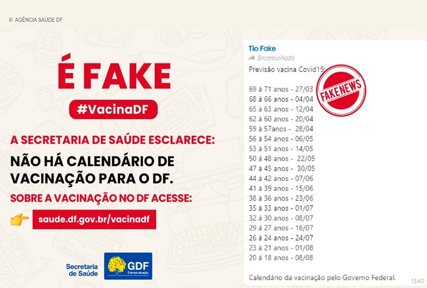 Um calendário de vacinação contra a covid-19 no Distrito Federal está circulando por mensagem via Whatsapp. A Secretaria de Saúde (SES) alerta: trata-se de mais uma fake news envolvendo a campanha de imunização preventiva contra vacinação para prevenção a doença causada pelo coronavírus.  A mensagem traz supostas datas em que pessoas com mais de 18 anos serão imunizadas no DF.