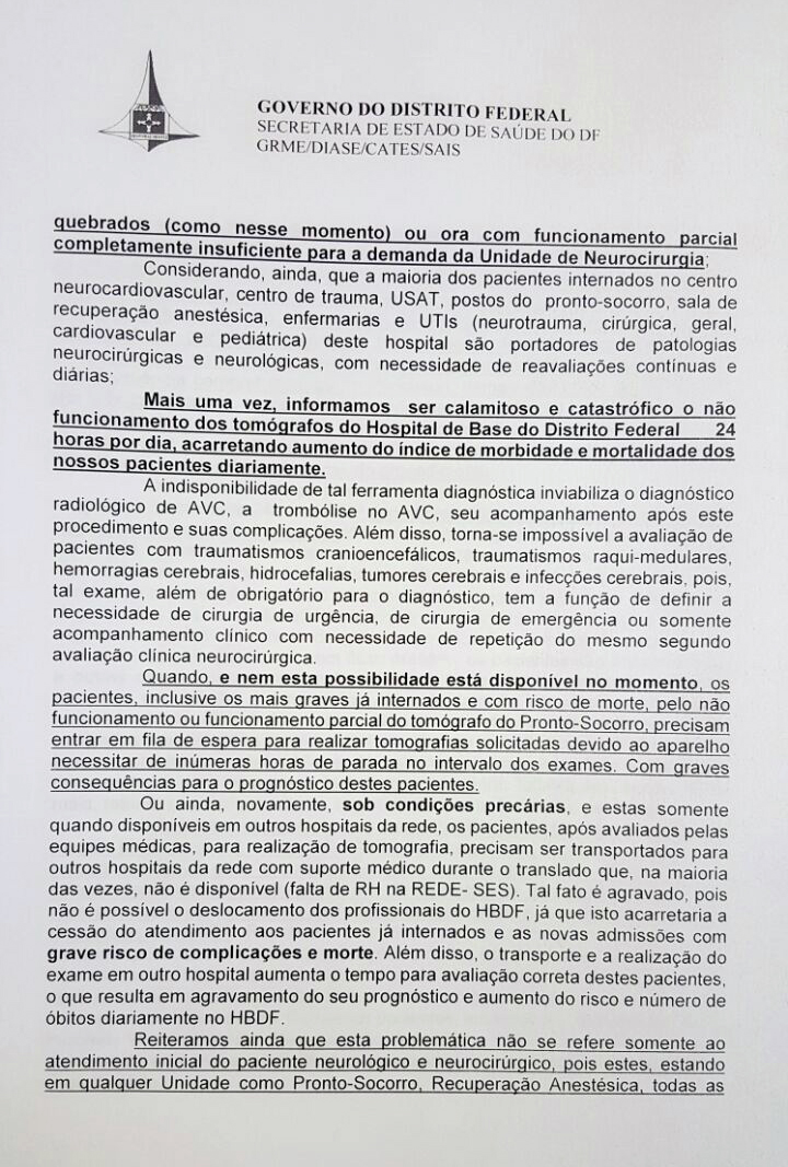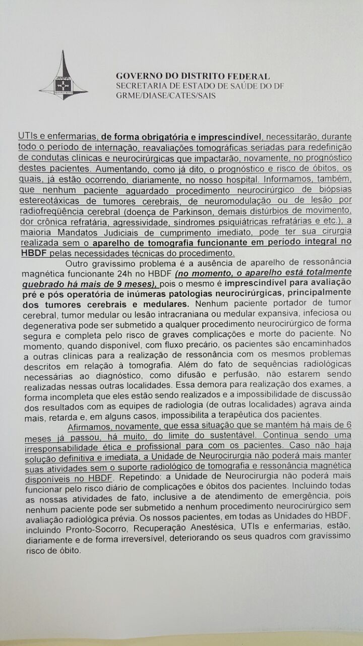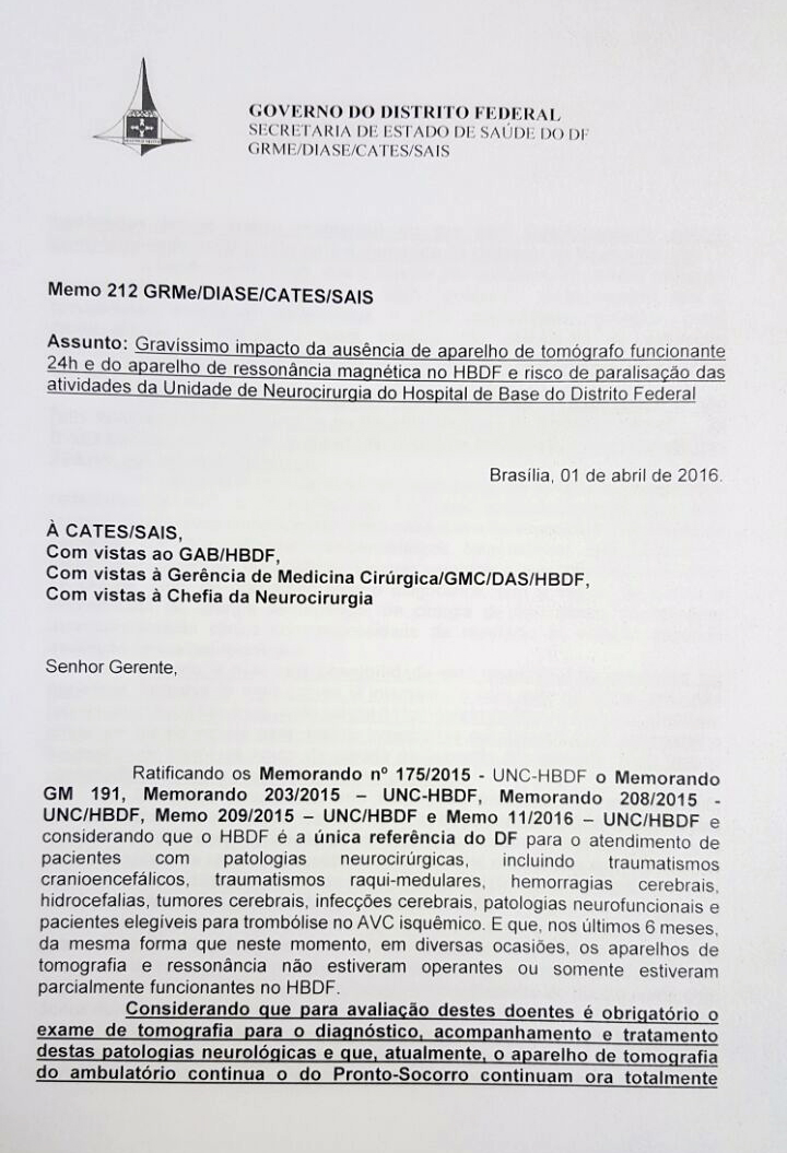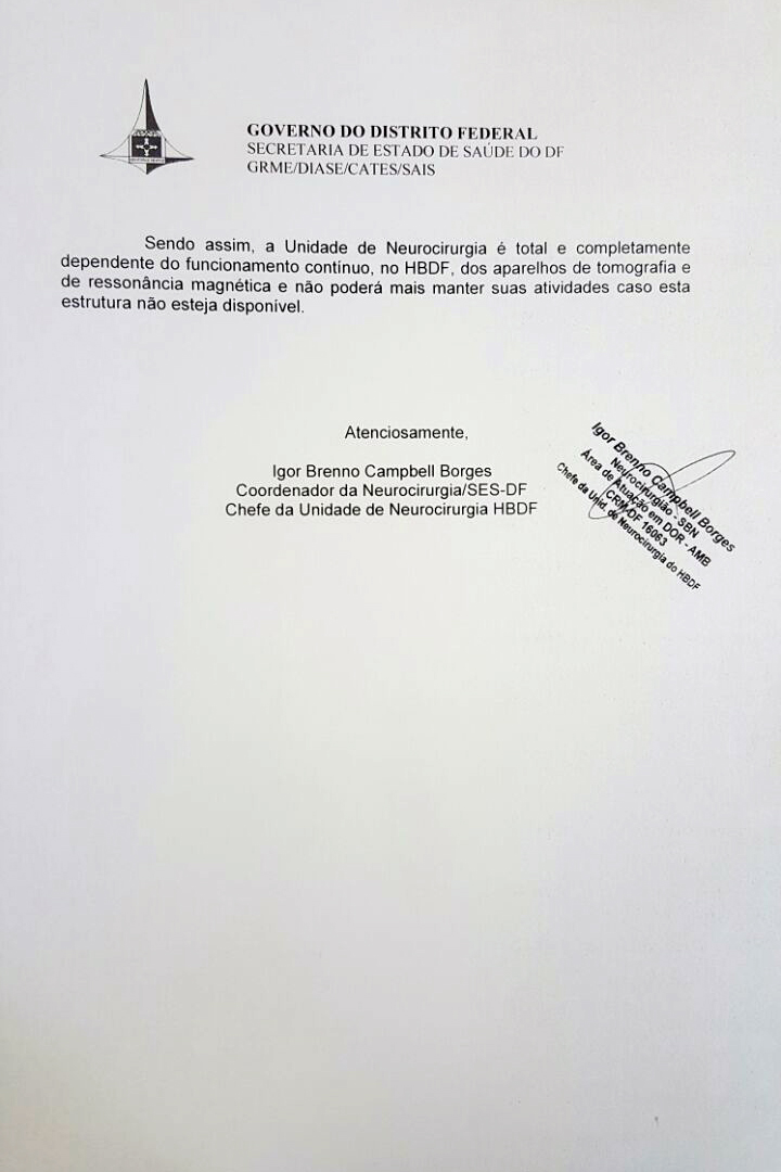 Na sexta-feira (1/Abr), o coordenador de neurologia da SES-DF e chefe da unidade de neurologia do HBDF, Igor Brenno Campbell Borges, Coordenador de Neurologia da Secretaria de Estado de Saúde do DF (SES-DF) encaminhou o Memorando 212. No documento um relato que reforça o colapso da capacidade de atendimento, em que informa a falta de aparelhos de tomografia e de ressonância magnética. Borges faz alguns alertas, falta de equipamentos reduz capacidade de salvar a vida de pacientes e que a única unidade de neurologia do DF pode parar.