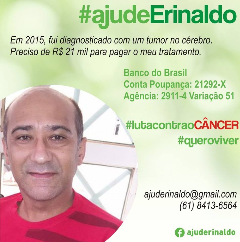 No último sábado (21), a família iníciou uma campanha nas redes sociais para mobilizar amigos e pessoas desconhecidas para ajudar no tratamento de Erinaldo. “O estágio da doença tem avançado e o orçamento da radioterapia realizado em um hospital particular, em Taguatinga, foi no valor de R$ 20.150”, revelou Jhemerson. “Mas não temos condições de arcar”, completou.