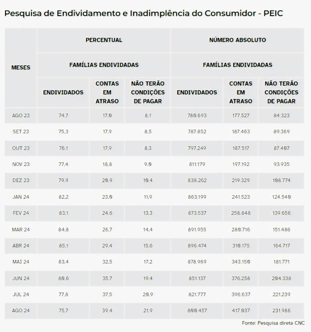 O percentual de famílias que relataram ter dívidas a vencer reduziu de 77,8%, em julho, para 75,7% em agosto, totalizando 800.457. Essa retração demonstra um esforço das pessoas com o objetivo de conter a inadimplência, que atingiu 39,4% no mês, face os 17% de agosto de 2023 – aumento de 131,76%. Os dados são da Pesquisa de Endividamento e Inadimplência do Consumidor (Peic) da Confederação Nacional do Comércio (CNC).