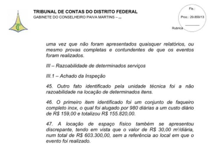 De acordo outra publicação do jornal Correio Braziliense (19/Mar), também sobre o mesmo tema, a informação observa que o kit locado deveria ser utilizado na ocasião da realização de 58 eventos, porém o TCDF relata a concretização de apenas 10.