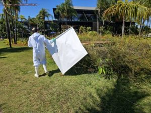 O objetivo foi realizar uma investigação ambiental e verificar se havia a presença do inseto no local. A técnica utilizada foi a de arrasto: uma lona amarrada em cabos de vassoura para entrar em contato com o solo e a vegetação, coletando possíveis carrapatos na fase jovem, período de maior transmissão.