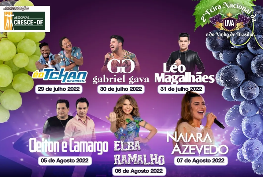 A Feira da Uva e do Vinho começa nesta sexta (29/7), às 17h, com show do grupo É o Tchan, no Parque de Exposição de Planaltina (DF). Nesta 2ª edição, o evento tem como novidade o espaço Arena Uva Music, que será palco dos artistas nacionais Gabriel Gava, Léo Magalhães, Cleiton e Camargo, Elba Ramalho e Naiara Azevedo. Visitações às 17h (quarta, quinta e sexta) e às 9h (sábado e domingo), com entrada gratuita. A classificação é livre.