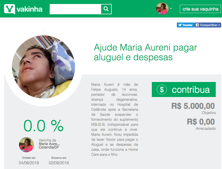 Sensibilizado com o caso de Maria Aureni que se encontra impedida de trabalhar para acompanhar o filho 24 horas enquanto estiver internado no HRC, com a devida autorização da mãe de Felipe Augusto, PD criou uma conta no site Vakinha Online, para tentar ajudar na arrecadação de recursos para suprir as despesas com aluguel. Para ajudar, basta clicar no link e fazer uma doação. Clique para fazer sua doação.