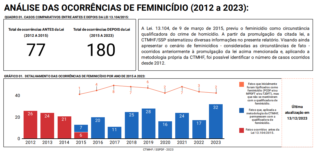 O DF fechou 2023, de acordo com dados da a Câmara Técnica de Monitoramento de Homicídios e Feminicídios (CTMHF), da Secretaria de Segurança Pública (SSP-DF), com 32 casos de feminicídios, número recorde na capital do país, desde 2012, ano em que a SSP-DF iniciou o monitoramento de assassinatos de mulheres a partir de qualificadora — assassinato de mulher com envolvimento de violência doméstica e familiar, menosprezo ou discriminação à condição de gênero da vítima —, que passou a ser tipificado, criminalmente, a partir da promulgação da Lei Federal nº 13.104/2015, em 9 de março de 2015.