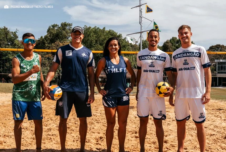 Os atletas de vôlei Daniel e Felipe e os de futevôlei, Lana Miranda, Lucão e Pedrinho, vão participar do festival | Foto: Pedro Naegele/Nero Filmes