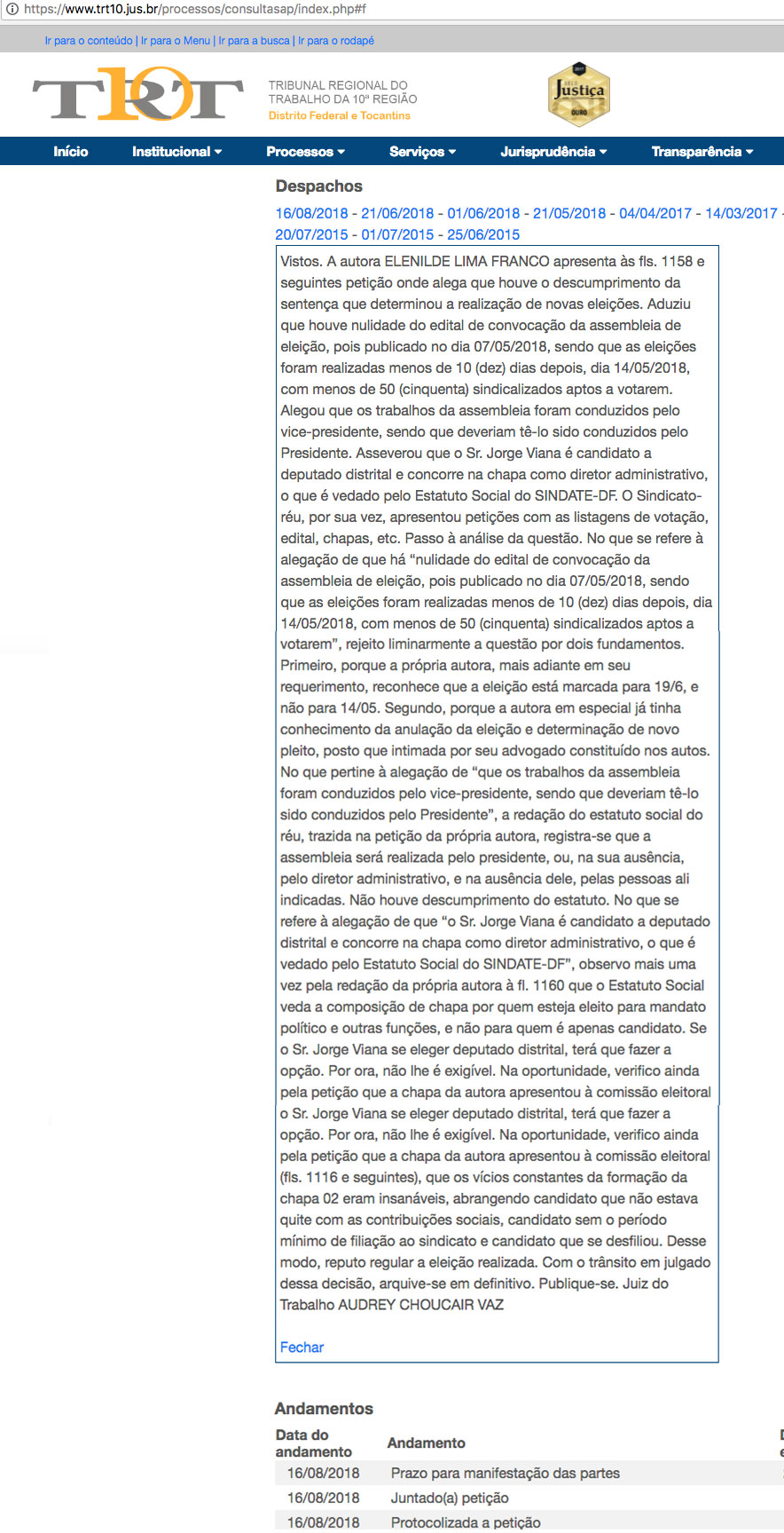 Entre os questionamentos do processo no. 0000850-83.2015.5.10.0015, a autora Elenilde Lima Franco, requereu a nulidade do edital de convocação da assembleia de eleição, a competência da condução do processo eletivo, além da regularidade de inscrição de um dos membros da chapa, nesse caso, do vice-presidente do SINDATE-DF, Jorge Vianna, por anunciar, naquela ocasião, a pré-candidatura a vaga para deputado distrital.