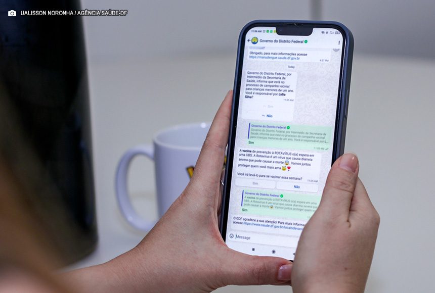 Neste mês, o Governo do Distrito Federal (GDF), por meio da Secretaria de Saúde (SES-DF), deu início ao projeto piloto de envio de mensagens de texto aos responsáveis para reforçar a vacinação de crianças menores de um ano. Nesta primeira fase, mais de 4 mil mensagens serão enviadas pelo aplicativo WhatsApp para 3,2 mil responsáveis, com o intuito de realizar uma busca ativa de crianças que estão com o cartão de vacinação desatualizado.