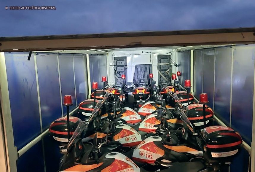 Eu sei, eu sei, as imagens as vezes enganam. Parece até um monte de motos de infratores apreendidas, de motoristas bebuns que caiu nas mãos da polícia. Você viu ontem? Mas, que nada, você está enganado, as bichinhas são novinhas, mesmo. São 26 motolâncias, zeradinhas, para os caras empinarem na cidade, digo, para os caras poder ganhar tempo para ajudar a salvar vida dos desastrados, digo, dos acidentados.