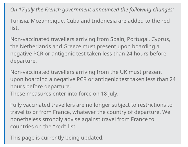Em tradução livre, o governo francês afirma que viajantes totalmente vacinados não estão mais sujeitos a restrições para viajar de ou para a França, seja qual for o país de partida. No entanto, aconselhamos fortemente contra a viagem da França para países da lista ‘vermelha’.