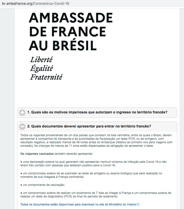 De acordo com informações da Embaixada da França no Brasil bem como do Ministério do Interior da França, as pessoas devidamente imunizadas que queiram viajar para a França, devem se atentar ainda a necessidade de apresentar declaração em que garante não apresentar nenhum sintoma de infecção pela Covid-19 e não terem tido contato com pessoas que testaram positivo para a Covid-19; se submeter ao teste de antígeno ou exame biológico no momento de sua chegada à França continental; apresentar comprovante de vacinação; realizar um isolamento de sete dias ao chegar à França; e realizar um teste de diagnóstico (PCR) ao final do período de isolamento.