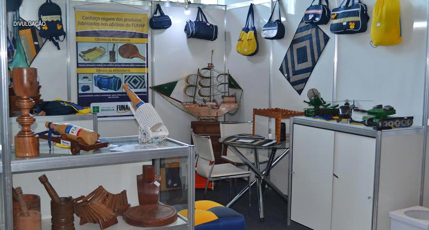 A Funap/DF trouxe para a feira parte dos objetos produzidos em duas de suas oficinas. Pelas mãos do apenados são fabricados os objetos rústicos em madeira maciça, usuais e decorativos, na oficina de marcenaria, expostos no evento. Além destas peças, por meio da parceria com os Correios, com o projeto Eco Postal, materiais em desuso foram doados pelo órgão à Funap e transformados nos mais variados modelos de bolsas e tapetes. São aproximadamente 80 produtos expostos que podem ser adquiridos ou encomendados por quem visita o estande.