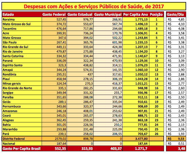 Uma postagem do ex-secretário de Estado de Planejamento e Orçamento do Maranhão (SEPLAN-MA), e de Estado de Saúde do DF (SES-DF), Fábio Gondim, na rede social Twitter, das Despesas com Ações e Serviços Públicos de Saúde, de 2017. A partir do estudo realizado pelo Conselho Federal de Medicina (CFM) (Veja Aqui), Gondim chamou atenção para os gastos do DF, em média, três vezes maior, que os 26 estados da Federação.