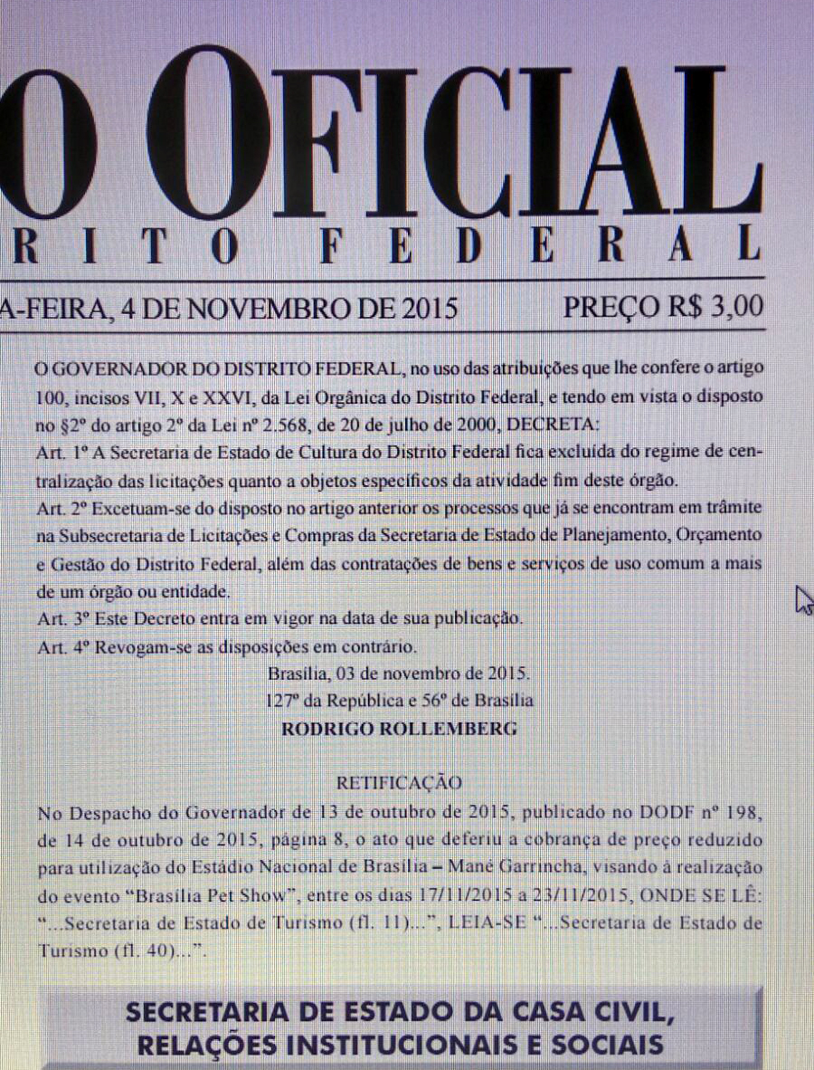 Na quarta-feira (4/Nov), o governador do DF, Rodrigo Rollemberg (PSB), publicou um decreto polêmico que concedeu autonomia à Secretaria de Estado de Cultura do DF (Secult) para realizar licitações e compras de bens e consumos pertinentes à Pasta.