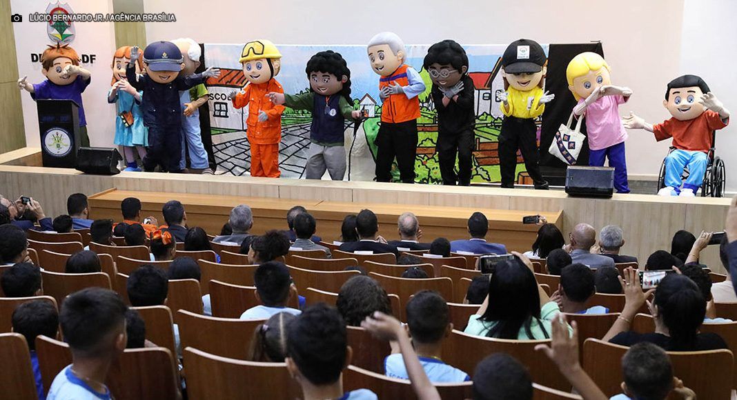 Crianças reunidas, risos no ar e muita segurança. Assim foi o lançamento do programa Turminha Mais Segura, nesta terça-feira (29), no auditório do edifício-sede do Departamento de Trânsito do Distrito Federal (Detran-DF). A ação apresenta os seis personagens das forças de segurança do DF, em uma peça teatral voltada para estudantes da rede pública.
