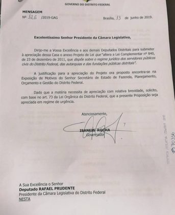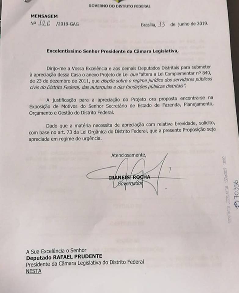 O projeto foi entregue por volta das 18h, no mesmo dia em que representantes de sindicatos foram à sede do Legislativo local pedir apoio dos deputados distritais para não aprovarem a proposta do governo de Ibaneis Rocha (MDB). Eles peregrinaram em cada um dos gabinetes tentando convencer membros da base e da oposição.