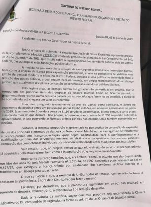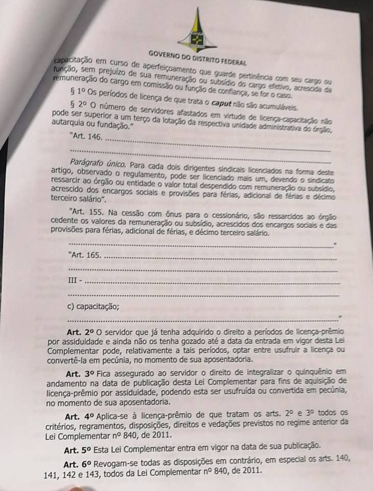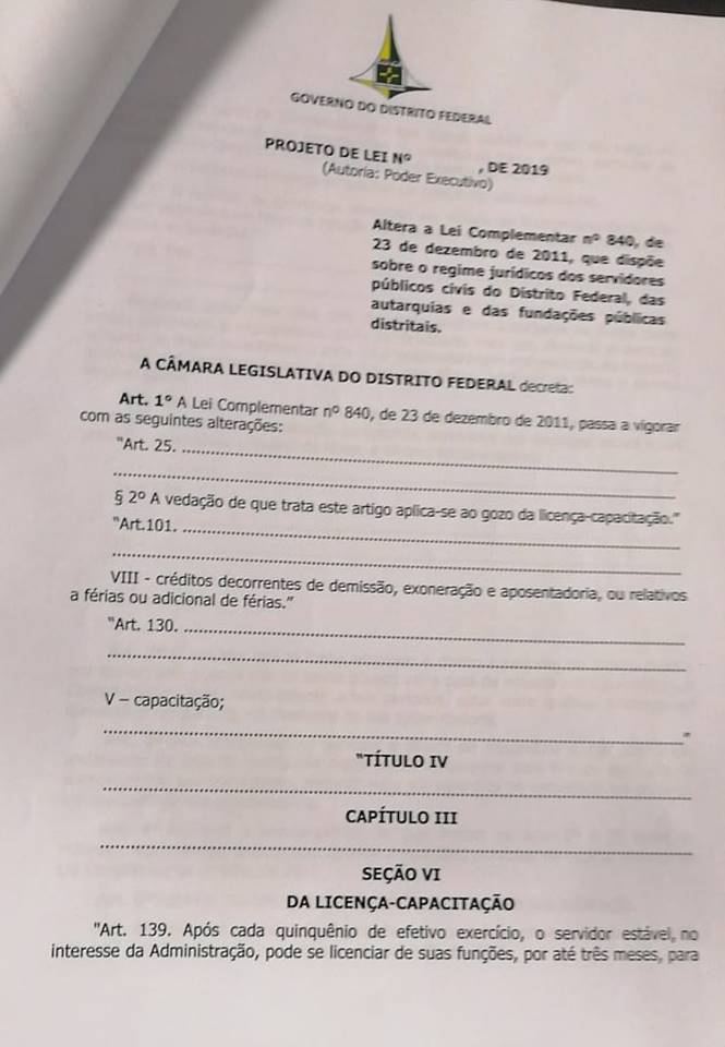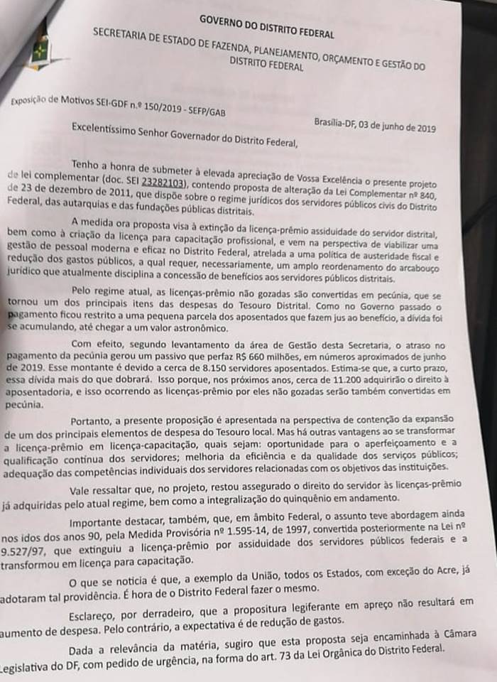 O Governo do Distrito Federal protocolou, no final da tarde desta quinta-feira (13/06/2019), na Câmara Legislativa, projeto de lei acabando com a licença-prêmio dos servidores públicos e criando a licença-capacitação. A proposta aponta para uma dívida de R$ 660 milhões com pecúnias para 1.850 servidores e justifica que, “a curto prazo”, a dívida dobrará por conta de 11.200 outros funcionários do Estado que adquirirão o direito.