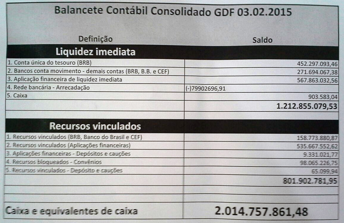 A fonte apresentou extrato do Balancete Contábil Consolidado do GDF de 3 de Fevereiro que indica recursos disponíveis na ordem de R$ 2 bilhões em caixa. Desse montante, aproximadamente R$ 1,2 bilhões de liquidez imediata. Isso indica a capacidade de pagamento do GDF que embora não seja contato como ativo circulante, indica a disponibilidade em caixa para honrar os compromissos imediatos do Governo. E outros R$ 800 milhões ainda podem ser somados para saldar a dívida.