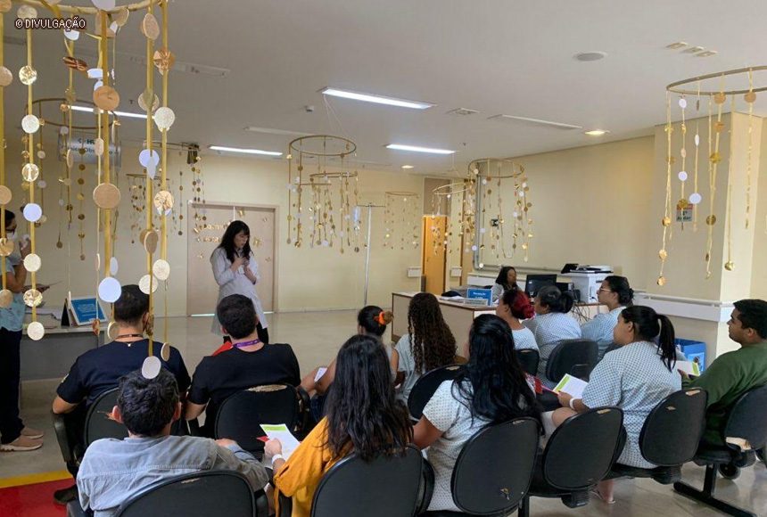 Como manda a lei do Agosto Dourado, a área da palestra foi decorada com ornamentações confeccionadas na cor dourada para receber a palestrante e as gestantes. Obra dos profissionais da Maternidade do bloco materno-infantil, a exemplo da chefe de Enfermagem, Glauciane Marinho, e da terapeuta ocupacional Kenia Daniel,