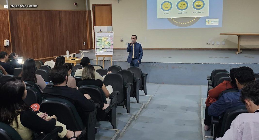 Em seguida, Rodarte convidou os participantes a se classificarem, de acordo com a faixa etária, como resistentes, indiferentes ou favoráveis às mudanças. Depois, explicou os diferentes tipos de transformação: voluntária e involuntária, além de abordar o impacto emocional que elas causam — negação, resistência, adaptação e, por fim, aceitação.