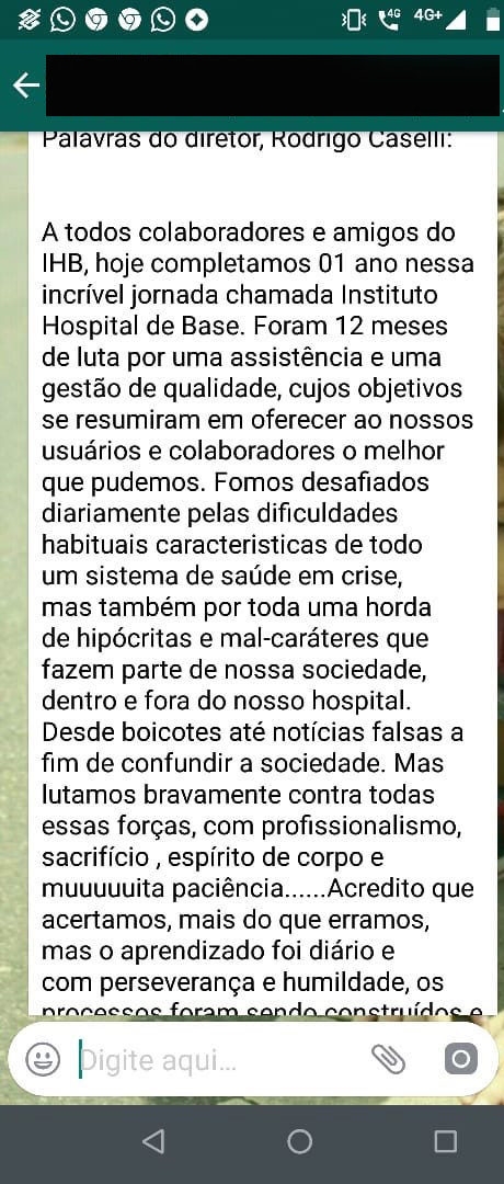A todos colaboradores e amigos do IHB, hoje completamos 01 ano nessa incrível jornada chamada Instituto Hospital de Base. Foram 12 meses de luta por uma assistência e uma gestão de qualidade, cujos objetivos se resumiram em oferecer ao nossos usuários e colaboradores o melhor que pudemos. Fomos desafiados diariamente pelas dificuldades habituais caracteristicas de todo um sistema de saúde em crise, mas também por toda uma horda de hipócritas e mal-caráteres que fazem parte de nossa sociedade, dentro e fora do nosso hospital. Desde boicotes até notícias falsas a fim de confundir a sociedade. Mas lutamos bravamente contra todas essas forças, com profissionalismo, sacrifício , espírito de corpo e muuuuuita paciência……Acredito que acertamos, mais do que erramos, mas o aprendizado foi diário e com perseverança e humildade, os processos foram sendo construídos e executados de forma incansável, sem compromissos com o erro ou com desvios de conduta. Cada um deu o seu melhor individualmente e como parte de um time. E esse time chegou longe. Mais do que apenas números e metas no contrato de gestão, a satisfação dos nossos pacientes, acompanhantes e colaboradores nos dá a certeza de que a luta não foi em vão e que vale a pena continuar. Nossa luta é pelo hospital, pela SES, por todo o SUS e pelo Brasil. Por todos os Brasileiros que acreditam num futuro melhor, numa assistência digna e eficiente a sua saúde. O desafio continua, ainda temos um longo caminho para a excelência do cuidado, mas nosso amigo e ex-presidente Ismael nos deixou esse legado e hoje não nos resta outro caminho que não seja seguir para o alto e avante!!! Parabéns a todos que participaram de alguma forma, e àqueles que mantêm a tenacidade e coragem de continuar no desafio de ser a institutiçao de saúde pública de alta complexidade que melhor cuida de pessoas no Brasil!!!” (SIC).