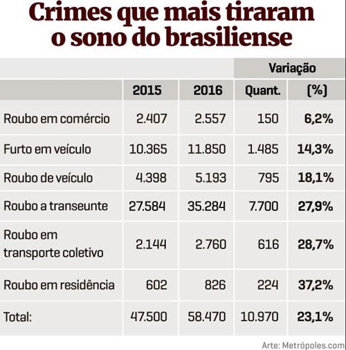 Os números expressam os aumentos da incidência de crimes em 2016, em relação ao ano anterior em casos de roubos em comércio; a transeuntes, em transporte coletivo; em residências além de roubos e furtos de veículos. Após ler a matéria, Rollemberg criticou a publicação ao questionar dados ausentes.