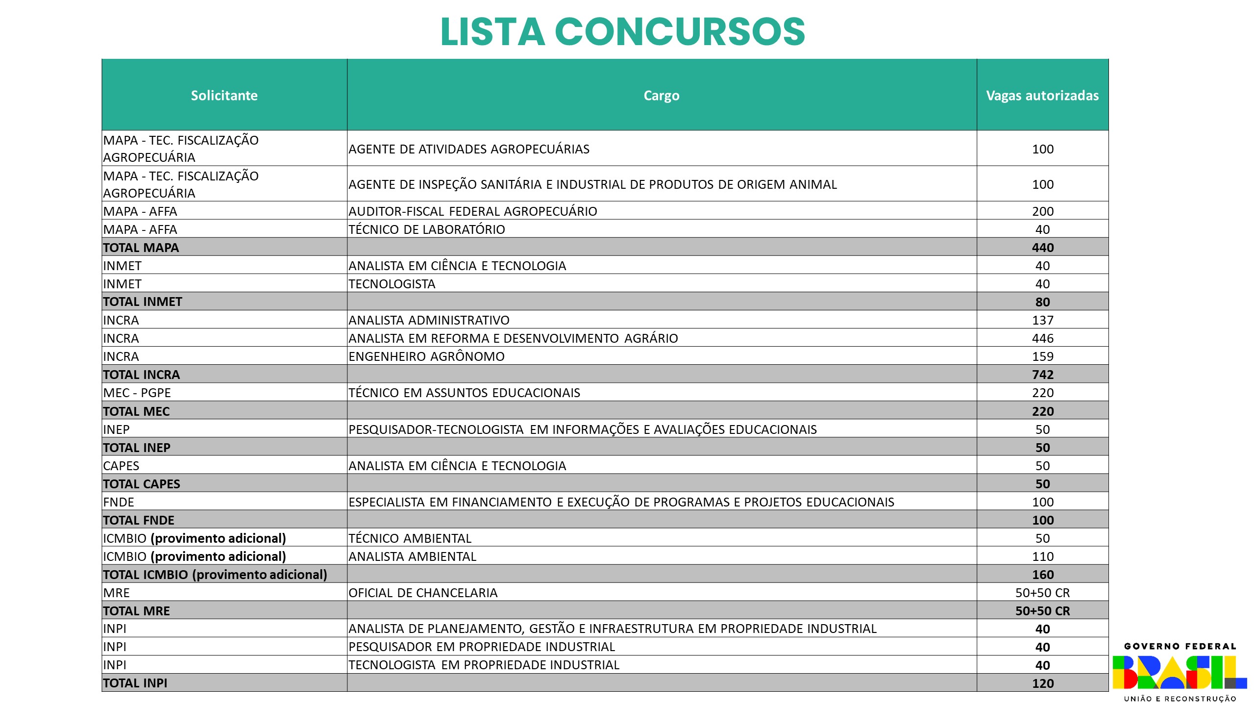 Este ano, o governo já havia autorizado os concursos de terceiro-secretário de carreira da diplomacia do Ministério das Relações Exteriores (30 vagas); analista, tecnologista e pesquisador no Ministério da Ciência e Tecnologia (814 vagas); analista ambiental no Ministério do Meio Ambiente e Mudança do Clima (98 vagas); 502 vagas de diversos cargos na Funai (Fundação Nacional dos Povos Indígenas). Além desses concursos para cargos efetivos, a ministra Esther Dweck também já havia assinado portaria autorizando o IBGE ((Instituto Brasileiro de Geografia e Estatística) a realizar concurso para 8.141 vagas de contratação temporária visando a realização do Censo. Com as novas autorizações, no total, são 5.880 vagas efetivas e 8.141 temporárias.