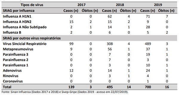 As outras doenças classificadas são o vírus sincicial respiratório (489 casos, sendo 3 mortes), Influenza A não subtipado (28 casos, 1 morte), Influenza B (5 casos, 2 mortes), Influenza A – H3N2 (9 casos) e outros vírus respiratórios (98 casos) – havendo mais um óbito por parainfluenza 1, parainfluenza 3, adenovírus e por metapneumovírus, cada.
