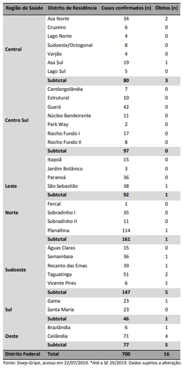 O maior número de casos fatais foi identificado em Ceilândia, onde quatro pessoas morreram em decorrência das complicações provocadas pelos vírus respiratórios. O Plano Piloto aparece como a segunda região, com três óbitos confirmados.