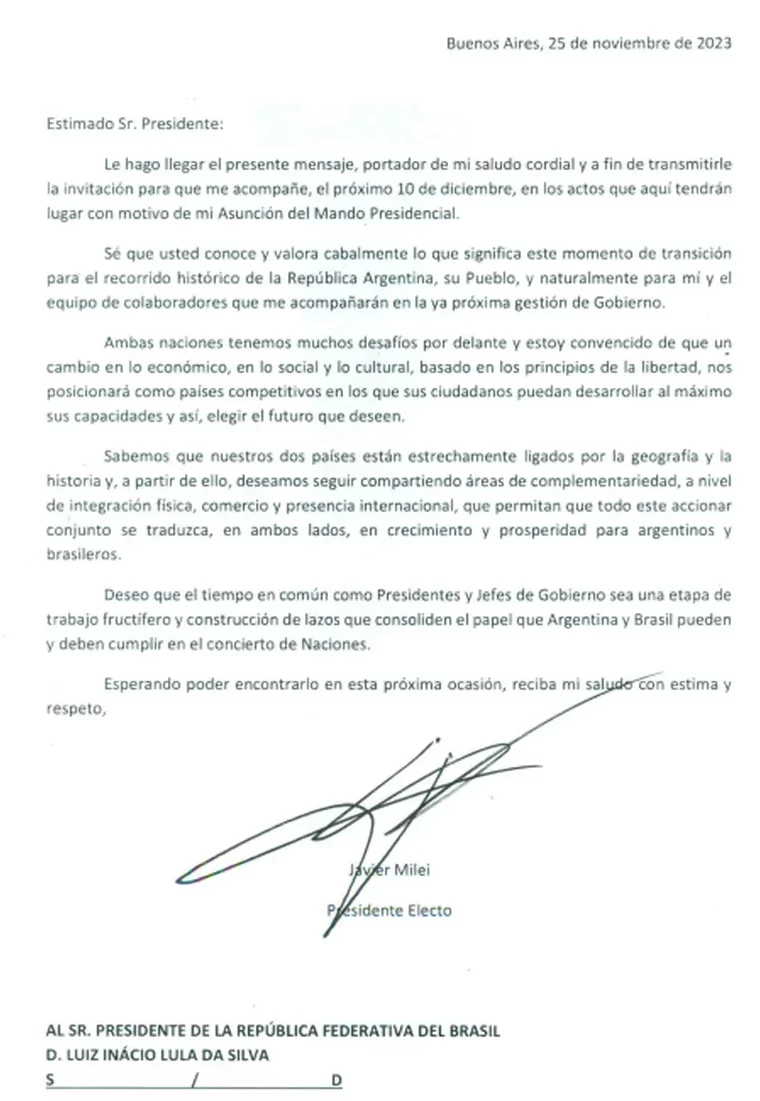 “Sei que você conhece e valoriza plenamente o que significa este momento de transição para o percurso histórico da República da Argentina, do seu povo e, naturalmente, para mim e para a equipe de colaboradores que me acompanhará na próxima gestão do governo. “Ambas as nações têm muitos desafios pela frente e estou convencido de que uma mudança econômica, social e cultural, com base nos princípios da liberdade, vão nos posicionar como países competitivos nos quais os seus cidadãos poderão desenvolver ao máximo suas capacidades e, assim, escolher o futuro que desejam.